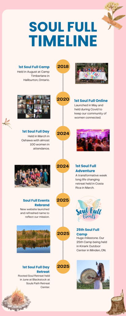 What started as a dream to create a retreat for women in 2018 has grown into a thriving community. With each camp and event, we’ve witnessed the incredible strength and beauty of women supporting each other. Today, Soul Full Events offers a range of experiences, from weekend getaways to virtual workshops, all grounded in our commitment to connection and transformation.